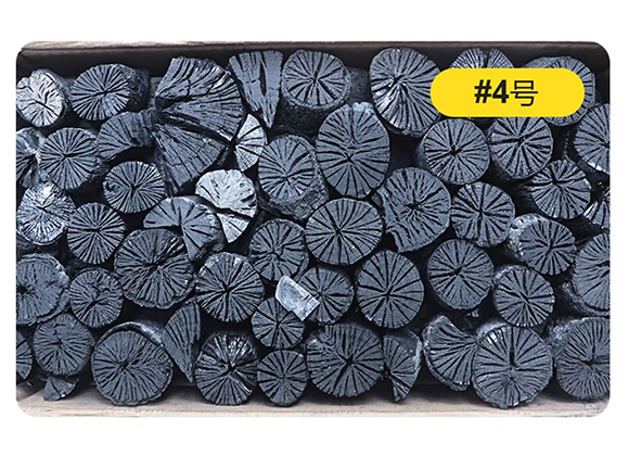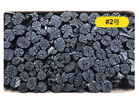 المواصفات التقنية: محتوى الكربون الثابت ≥ 90%، نسبة الرماد ≤ 4%، الرطوبة ≤ 9%، القيمة الحرارية ≥ 8000 كيلو كالوري/كجم، زمن الاحتراق: 5–6 ساعات